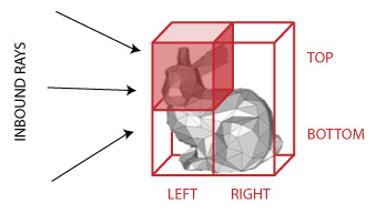 To see how acceleration works, consider the figure below. Here, several inbound rays are about to be intersect-tested against a 3D object (in this case, a low-complexity version of the classic Stanford Bunny). The triangular faces that comprise the surface mesh of the bunny are clearly visible. In a naïve ray tracer, each inbound ray would be intersect-tested against each polygon in the bunny, yielding a per-ray time complexity linear in the number of polygons.