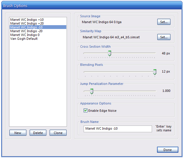 Name the brush—give your new brush a descriptive name. For example, if the source image that will exemplify the style of the new brush is a predominantly Indigo color and has been extracted from a Manet painting, you might call your new brush “Manet Indigo.” Whatever name you pick, rename the brush object by clicking in the text edit area in the “Brush Name” region of the dialog box. Delete the old name and type your new name, then press the [ENTER] key to set the new name.