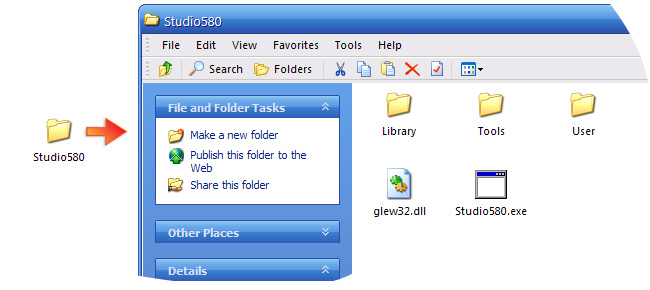 Certain files and folders are repeatedly mentioned in the Studio580 documentation. The names and relative locations of these oft-mentioned files and folders are shown in the figure below, which illustrates the directory structure of a freshly unpacked Studio580 distribution.