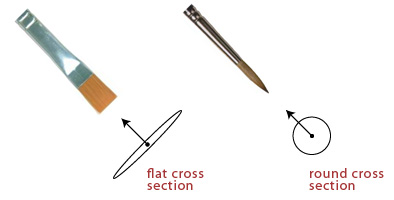 Studio580’s brush tool simulates a traditional kind of artist’s brush, called a flat. Flats stroke out pigment by tracing a flat, elliptical cross section across the surface of a canvas. This is in contrast to other kinds of brushes, like rounds and filberts, whose cross sections are more fully rounded. The difference in cross section appearance between flats and more rounded brushes is illustrated in the figure below: