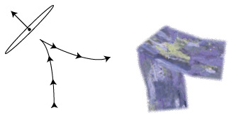 Very tight turns are interpreted as reversals of brush direction—if you make a very tight turn (> 88 degrees) in your stroke, Studio580 will interpret it as a reversal of brush direction, in which the sweeping edge of the brush instantaneously changes. The associated visual effect is the placement of a flat end cap at the point where you made your turn. This behavior simulates the way many real artsits handle flats, and is illustrated below.