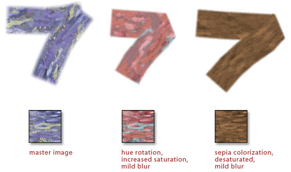 Studio580 allows you to paint in a style similar to that seen in a source image you provide. Of course, by furnishing different source images, you can paint in radically different styles. However, you can also paint in different variations on the same style. You do this by using an image processing tool to subtly alter your source image while leaving other brush parameters the same. The Studio580 user interface provides several controls that make this process relatively easy. Furthermore, provided the alterations you make to your source images aren’t that drastic and don’t involve convolutions with large supports (i.e. > 3 × 3 pixels), you can share one single similarity map among a large number of source images that have all been transformed from the same precursor. This technique is illustrated in the following figure.